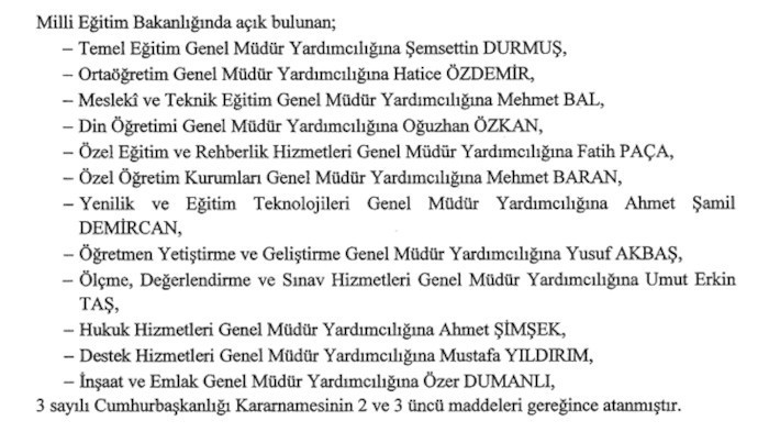 DUVAR – Atama kararları Cumhurbaşkanı Tayyip Erdoğan’ın imzasıyla Resmi Gazete’nin bugünkü sayısında yayımlandı.