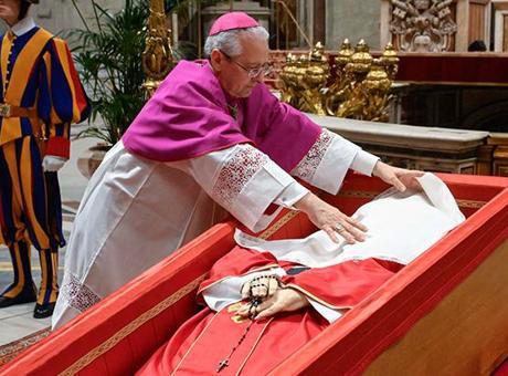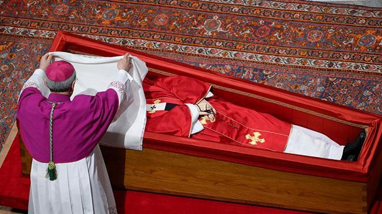 Cenaze töreni öncesinde papanın yüzüne beyaz bir bez örtüldü ve tabut kapağı kapatıldı.